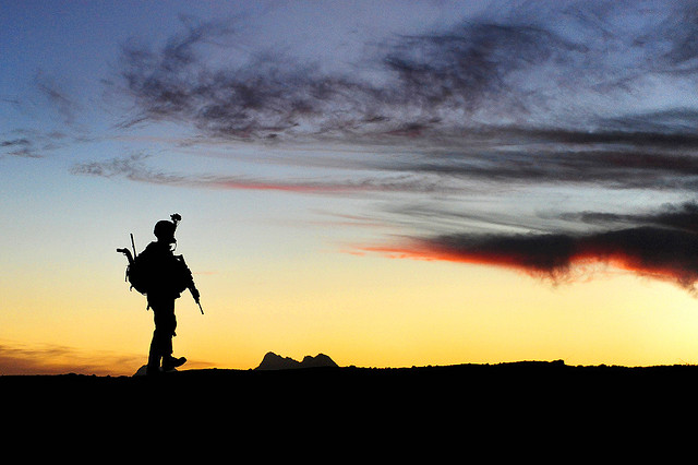 A U.S. Soldier with Charlie Company, 1st Battalion, 17th Infantry Regiment walks to a joint district community center after securing combat outpost Rajankala in the Kandahar province of Afghanistan Nov. 26, 2009. (DoD photo by Tech. Sgt. Francisco V. Govea II, U.S. Air Force/Released)